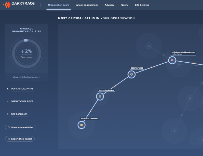 Attack engagements give teams the opportunity to test human risks with real phishing emails sent from internal accounts. Attack path modeling places all risks in context with associated difficulty scores validating the ease with which an attacker can use their desired technique. Darktrace may also be used to augment independent pen-testing efforts.